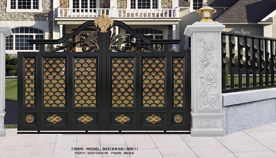 別墅庭院大門(mén)材質(zhì)選用高端硬鋁合金型材,以及整體實(shí)心鑄鋁花件,純手工拼接制作而成。